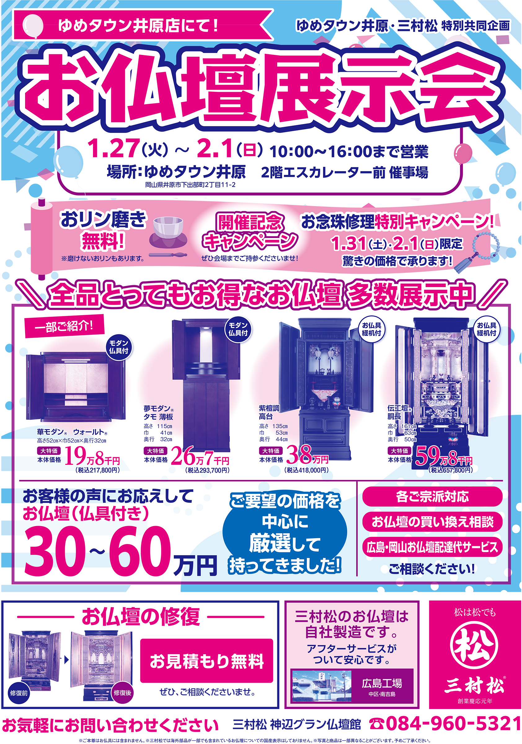 本日1月27日(火)より2月1日(日)まで、ゆめタウン井原(岡山県井原市下出部町2丁目11-2)2階エスカレーター前催事場におきまして、お仏壇展示会を開催中です。(営業時間 10:00~16:00)